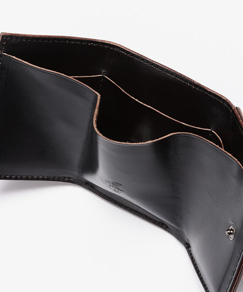 A tri-fold wallet designed to be as small as possible. At this size bills can be stored without being folded. The coin case on the front has a gusset and is easy to take out coins. Features 3 pockets that can hold several cards inside, and it is very easy to use. The moist texture and heavy weight of the leather gives a rugged impression.